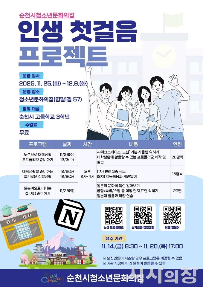 순천시는 수능을 마친 고3 전환기 청소년들을 위해 실용 중심의 진로·자립 역량 강화 프로그램인 ‘인생 첫걸음 프로젝트’를 본격 운영한다.