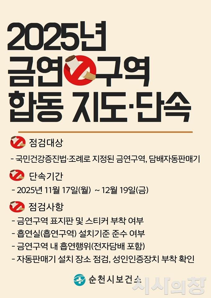순천시는 전라남도와 함께 오는 17일부터 19일까지 「국민건강증진법」과 「순천시 금연환경 조성 및 간접흡연 피해방지 조례」에 근거한 금연구역 합동 지도·점검을 실시한다. 이번 점검은 흡연 민원이 잦거나 흡연 우려가 높은 공중이용시설을 중심으로 진행되며, 청사, 음식점, 게임제공업소 등이 중점 대상이다.