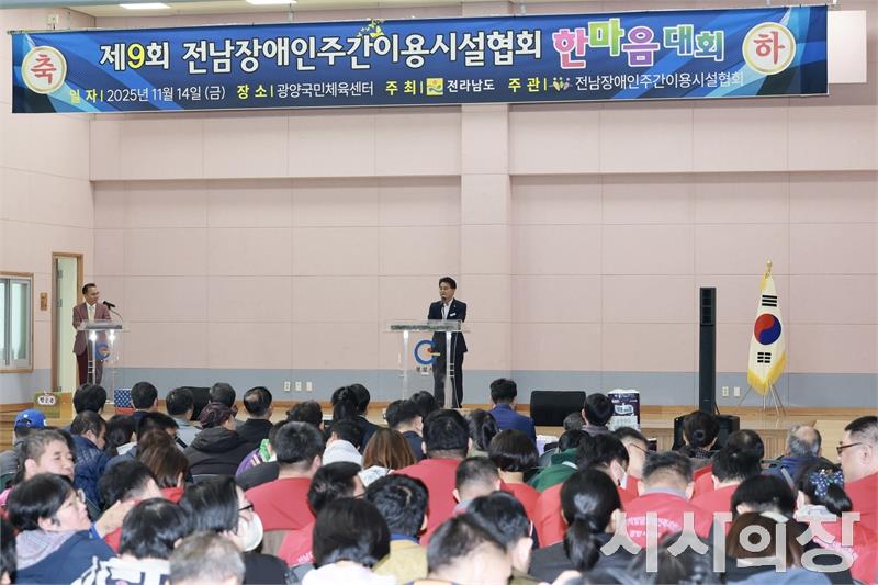 전라남도의회 김태균 의장은 11월 14일 광양국민체육센터에서 열린 ‘제9회 전남장애인주간이용시설협회 한마음대회’에 참석하여 유공자 표창과 함께 시설 종사자들을 격려‧위로했다.[시사의창=송상교기자]