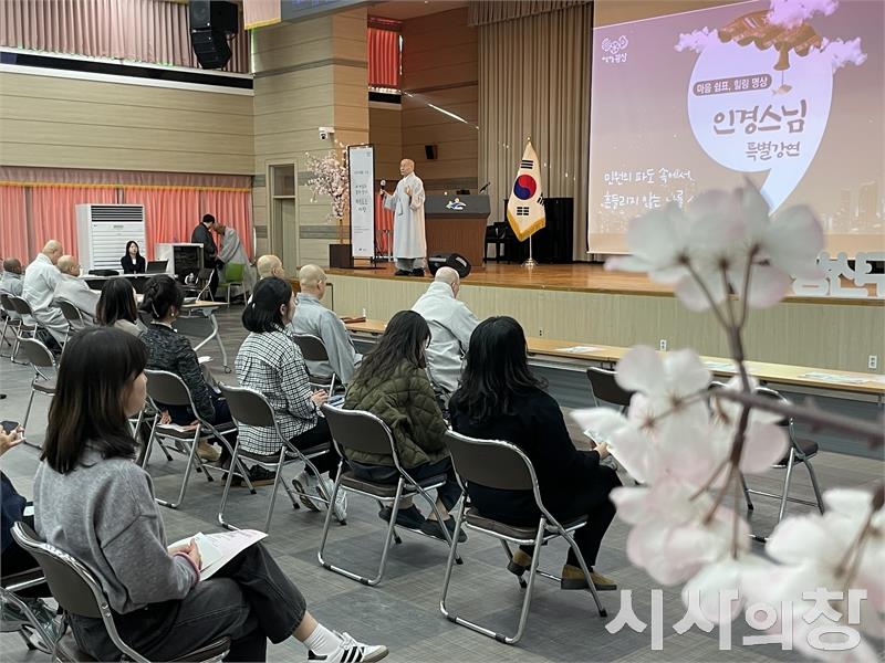 광주광역시 광산구가 민선8기 ‘따뜻한 공동체’ 구현을 위해 14일 구청 7층 윤상원홀에서 대민 업무 공직자 100여 명을 대상으로 명상의 대가 인경 스님 초청 특별강연을 개최했다.광산구는 만성적 감정 노동과 악성 민원 등으로 인한 공직자들의 탈진(번아웃) 현상을 해소하기 위해 마련했다.[시사의창=송상교기자]