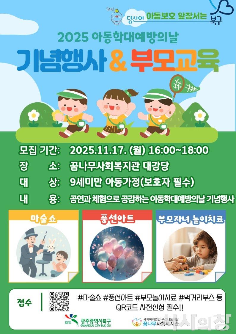 [시사의창=송상교기자] 광주광역시 북구가 아동학대 예방의 날(11월 19일)을 맞아 오는 17일 오후 4시 꿈나무사회복지관에서 기념행사를 열고 아동 보호와 건강한 양육 환경 조성을 위한 지역사회의 의지를 다진다.