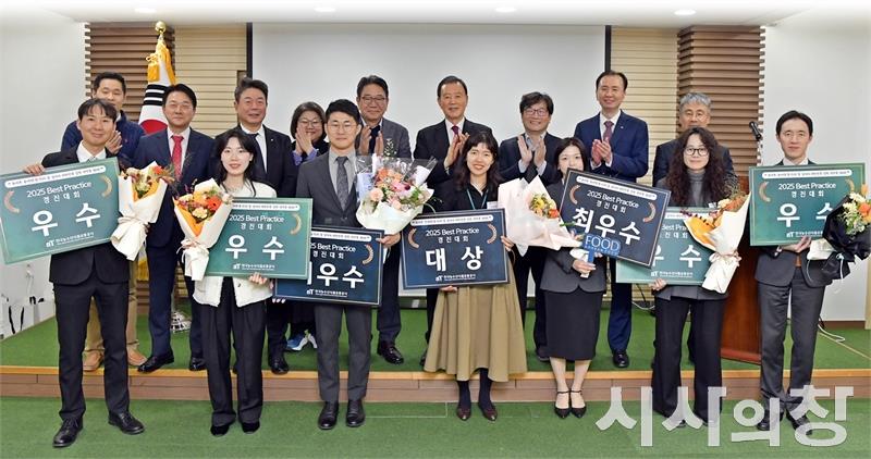 한국농수산식품유통공사(aT)는 17일 나주 본사에서 ‘2025년 경영혁신 BP(Best Practice) 경진대회’를 개최하고, 국민 삶의 질 향상과 국정과제 이행에 기여한 우수성과를 공유하는 자리를 마련했다. 사진은 2025 경영혁신 BP경진대회 수상자 기념사진.[시사의창=송상교기자]