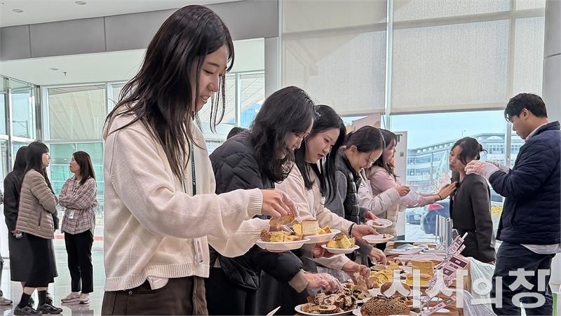 한국농수산식품유통공사(aT)는 17일 aT 나주 본사에서 시민과 공공기관 임직원을 대상으로 가루쌀빵 시식회를 열었다.이번 시식회는 가루쌀 제과제빵 메뉴를 알리고 ‘2025년 가루쌀빵 20% 할인행사’를 홍보하기 위해 마련됐다. 사진은 aT 나주본사에서 진행된 가루쌀빵 시식 현장 전경.[시사의창=송상교기자]