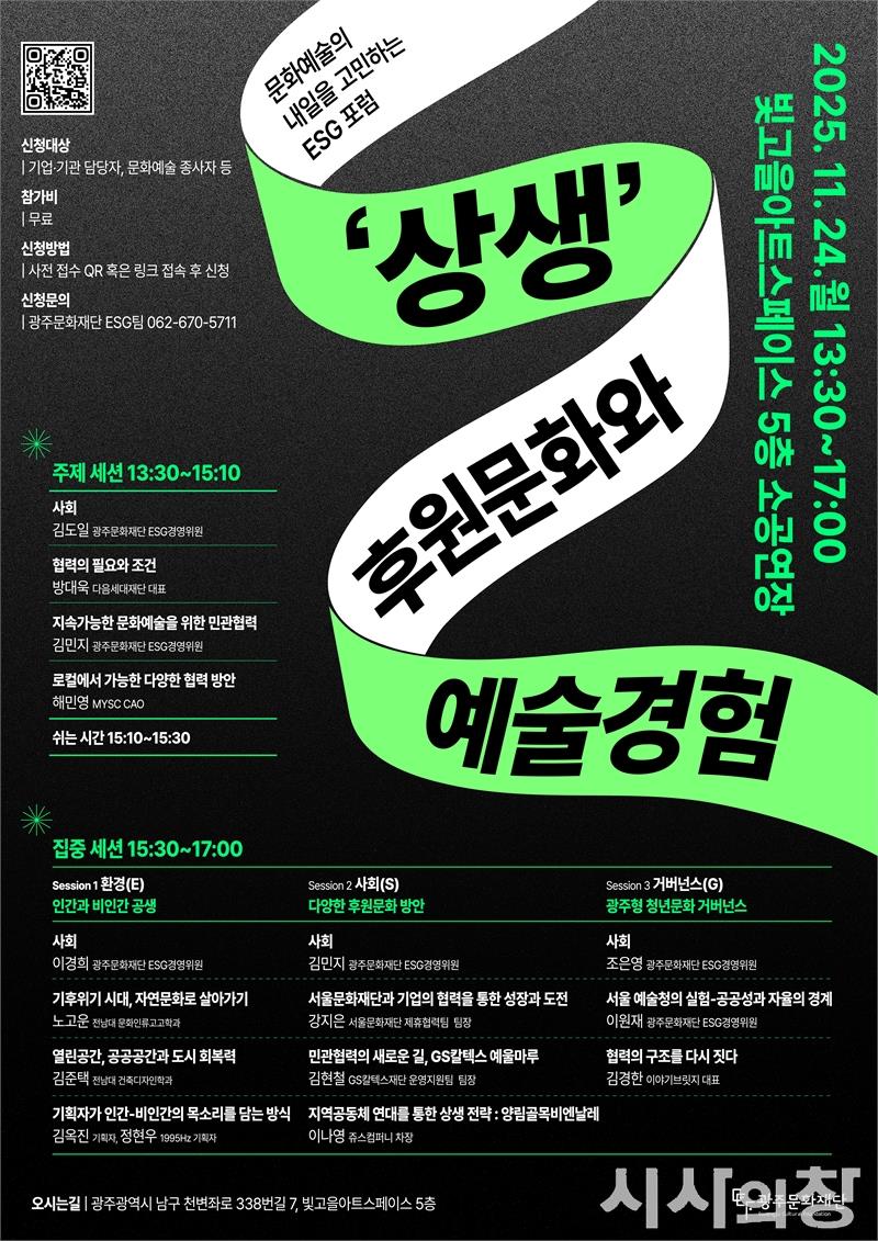 광주문화재단은 오는 24일 오후 1시 30분, 광주 남구 빛고을아트스페이스 소공연장에서 ‘문화예술의 내일을 고민하는 ESG 포럼’을 개최한다. 이번 포럼은 ‘상생’이라는 대주제 아래, ‘후원문화와 예술경험’을 키워드로 문화예술 분야의 지속가능한 협력 구조와 후원문화 확산 방안을 논의하기 위해 마련됐다.[시사의창=송상교기자]