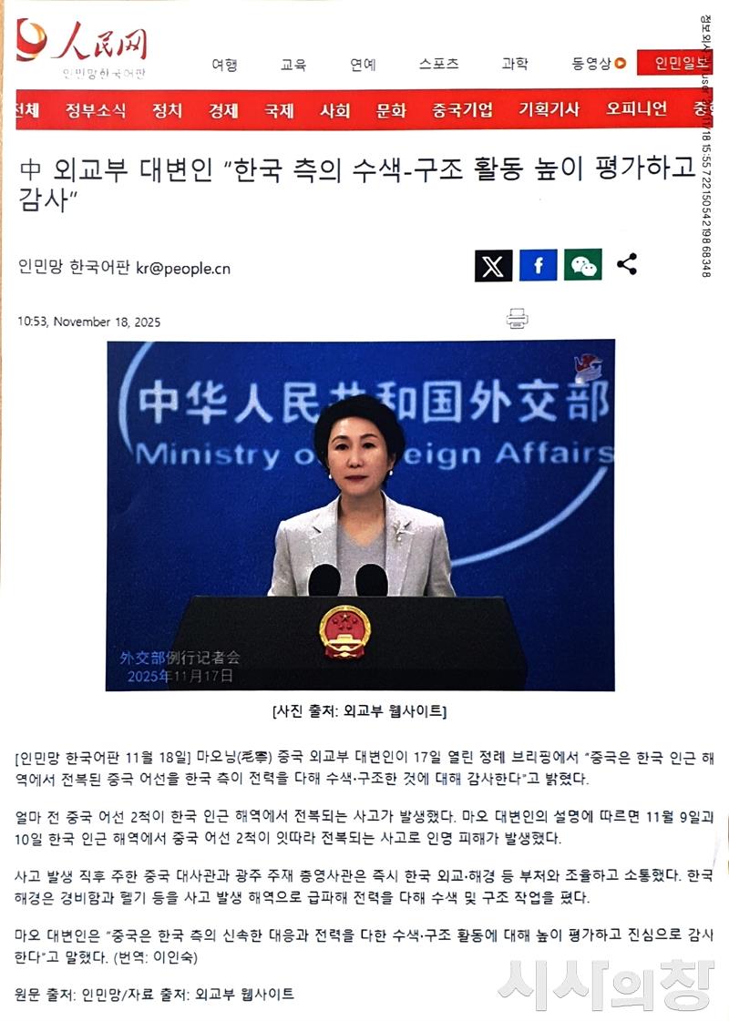 중국 외교부 마오닝 대변인은 17일 정례 브리핑에서 “한국 측이 전력을 다해 수색 및 구조 작업을 전개한 것을 높이 평가하며, 진심으로 감사한다”고 밝혔다. 이는 9일 전남 신안군 가거도 해상과 10일 전북 군산 어청도 해상에서 잇따라 발생한 전복 사고에 대한 중국 정부의 공식 입장이다.