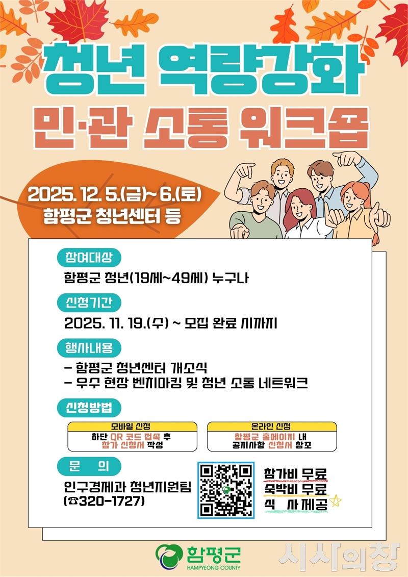 함평군은 21일 “관내 19~49세 청년을 대상으로 ‘청년 역량강화 민관 소통 워크숍’ 참가자 50명을 선착순 모집한다”고 밝혔다. 참가비는 전액 무료다.