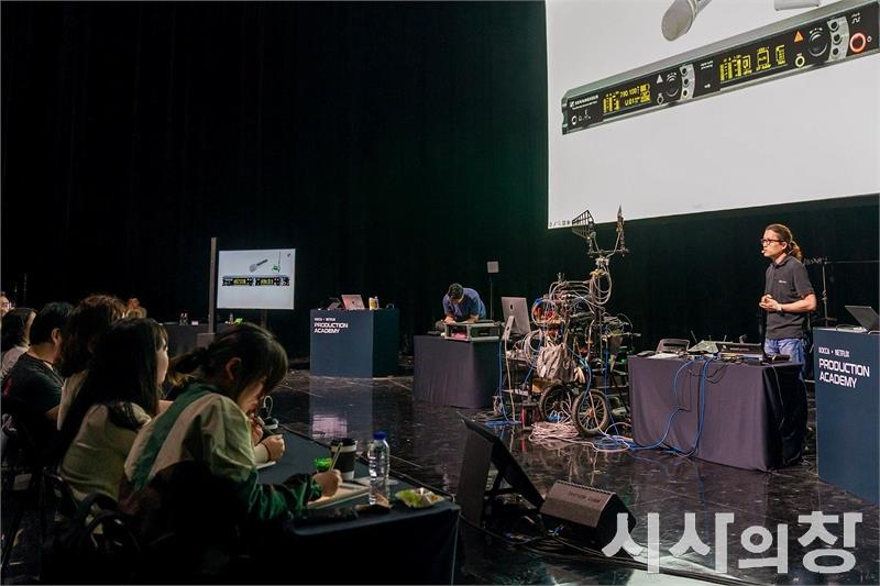 문화체육관광부와 한국콘텐츠진흥원은 넷플릭스(Netflix)와 함께 6월부터 11월까지 콘텐츠인재캠퍼스와 CKL기업지원센터 등에서 글로벌 온라인 영상 서비스 제작 역량 강화를 위한 ‘2025 KOCCA x NETFLIX Production Academy’ 교육 과정을 성공적으로 마무리했다.사진은 프로덕션 사운드 워크숍 모습.[시사의창=송상교기자]