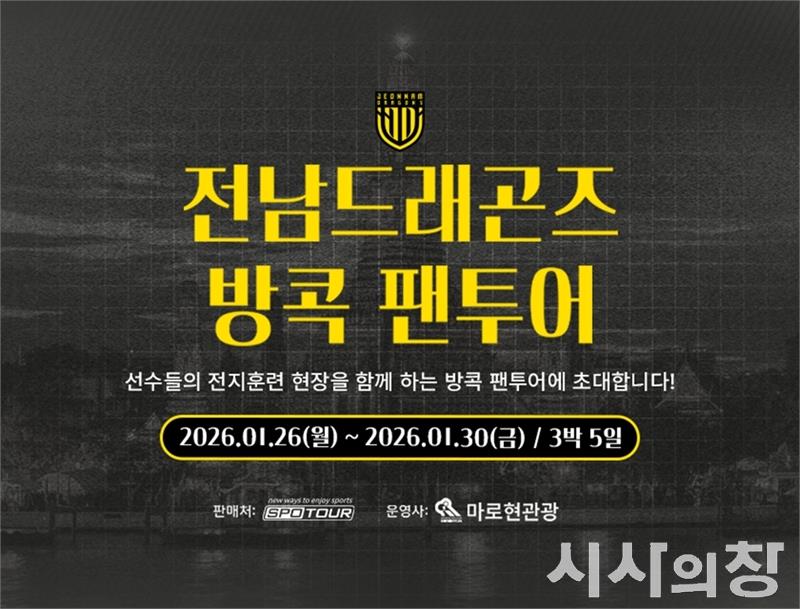 전남드래곤즈가 2026 프리시즌 방콕 전지훈련 팬투어를 진행한다.이번 팬투어는 팬들의 해외 전지훈련 방문 니즈를 충족하고, 성공적인 2026시즌을 위해 방콕에서 훈련에 매진하는 선수단에게 팬들의 응원을 직접 전하기 위해 기획됐다. 투어 일정은 2026년 1월 26일(월)부터 1월 30일(금)까지 3박 5일로, 선수단 방문과 시내 관광 등 짧지만 알찬 패키지로 구성돼 있다.[시사의창=송상교기자]