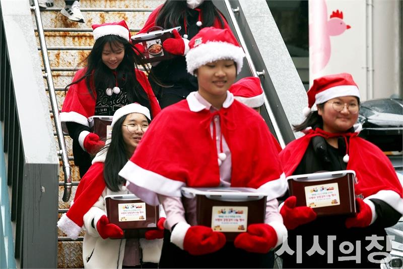 광주광역시 북구가 다가오는 연말을 맞아 돌봄 이웃들에게 김치로 온정을 전한다.23일 북구에 따르면 다음 달 17일까지 27개 동 행정복지센터, 지역사회보장협의체, 새마을부녀회 등이 참여하는 김장 나눔 행사가 순차적으로 진행된다. 사진은 지난해 운암2동 김장행사에 참여한 금호중앙중 학생들이 경로당에 김치를 전달하는 모습.[시사의창=송상교기자]