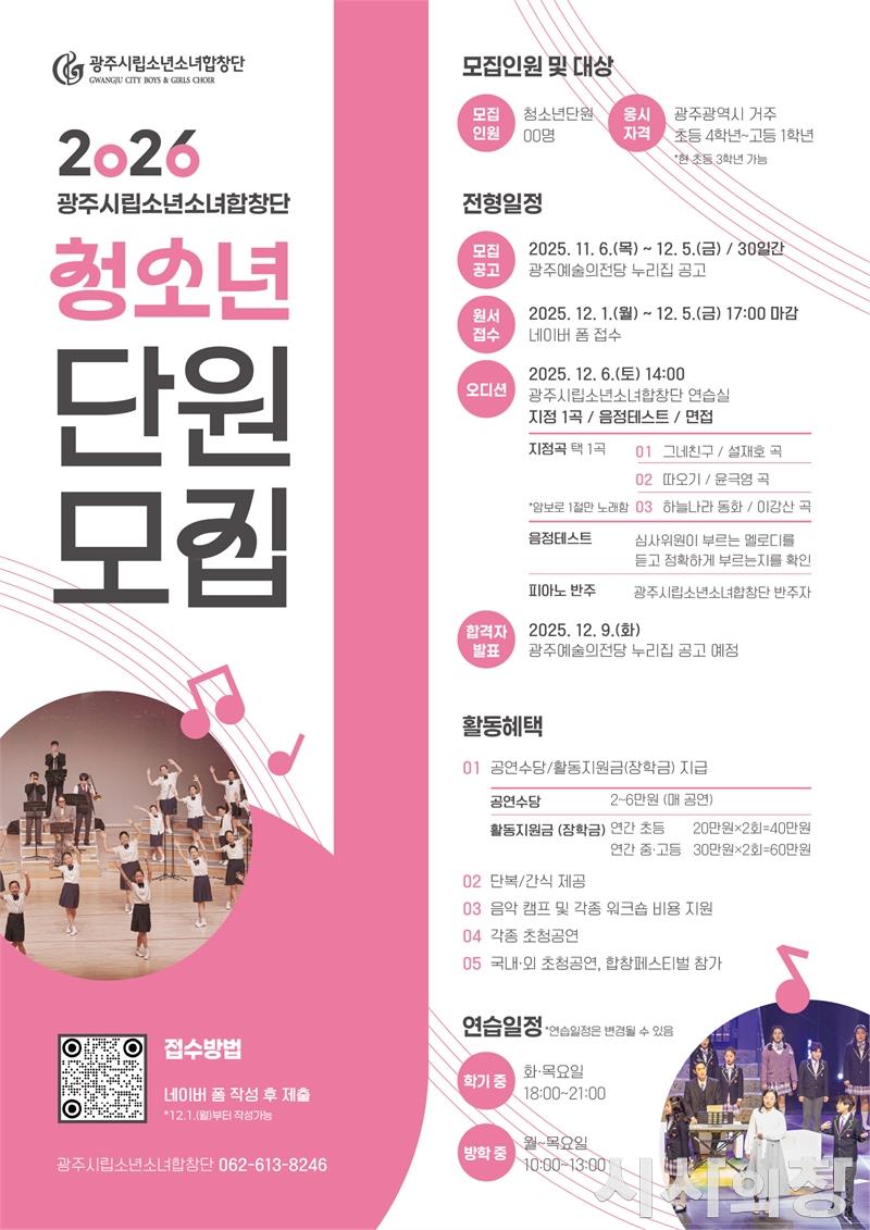 광주시립소년소녀합창단이 2026년 상반기 청소년단원을 공개 모집한다. 꿈과 재능이 있고 용모 단정한 광주 거주 초등학교 4학년(현재 초등학교 3학년 응시가능)부터 고등학생 1학년까지 누구나 응시 가능하다.[시사의창=송상교기자]