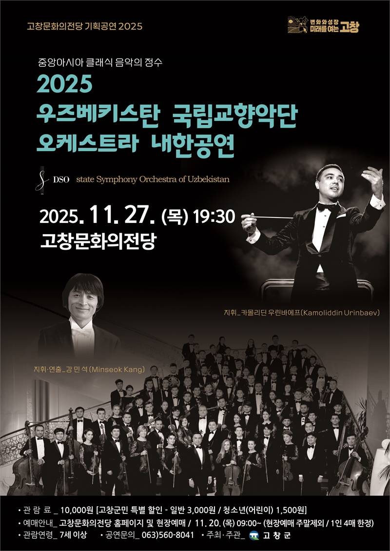 오는 11월 27일 저녁 7시 30분, 고창문화의전당 대공연장에서 ‘우즈베키스탄 국립교향악단 오케스트라 내한공연’이 펼쳐진다. 이번 공연은 중앙아시아 최고 수준의 교향악단이 선보이는 정통 클래식과 한국적 음악의 조화라는 점에서 주목된다.