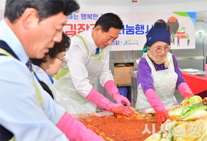 장성군여성단체협의회 회원들이 24~25일 이틀간 여성회관에서 ‘사랑의 김장김치 나눔’ 행사를 가졌다.회원들은 김치 800여 포기를 담가 지역 내 230가구에 직접 전달해 훈훈한 미담을 남겼다.사진은 김한종 장성군수가 25일 김장 나눔 행사장을 찾아 일손을 거들었다. [시사의창=송상교기자]