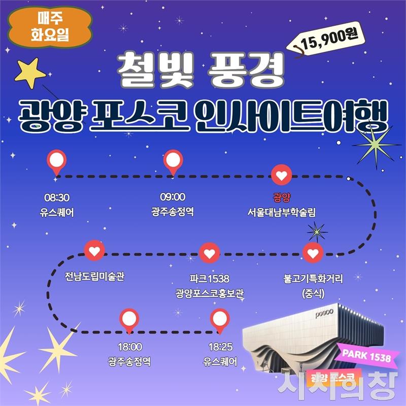 광양시는 오는 12월부터 남도한바퀴 겨울테마 ‘광양 포스코 인사이트 여행’을 매주 화요일 운영한다고 밝혔다.12월 2일 첫 닻을 올리는 이번 여행은 서울대학교 남부 연습림 관사, 포스코홍보관 Park 1538, 전남도립미술관 등 역사·산업·예술을 아우르는 특화코스로 구성됐다.[시사의창=송상교기자]