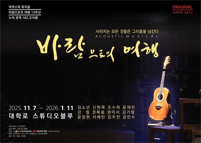 뮤지컬 〈바람으로의 여행〉은 지난 11월 7일 개막해 2026년 1월 11일까지 두 달간 서울 대학로 스튜디오 블루에서 관객을 만난다. 2012년 대구 초연 이후 13년 동안 865회 공연, 누적 관객 16만 2천여 명을 기록한 이 작품은 김광석의 음악을 가장 따뜻하게 해석한 소극장 뮤지컬로 손꼽히며 스테디셀러로 자리매김해 왔다.
