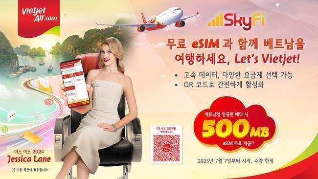 비엣젯항공은 오는 12월 31일까지 자사 홈페이지와 모바일 앱을 통해 베트남행 항공권을 예약한 승객에게 500MB 고속 데이터가 포함된 ‘SkyFi eSIM’을 무료 제공한다. 재고 소진 시까지 진행되는 이번 혜택은 베트남 도착 후 31일 동안 사용할 수 있어, 단기 여행은 물론 중장기 체류 일정에도 유용하게 활용 가능하다. 예약 과정에서 추가 서비스 선택 단계에서 무료 eSIM 옵션을 선택하면 결제와 동시에 이메일로 eSIM이 발송되고, QR코드를 스캔하는 것만으로 바로 개통을 마칠 수 있는 방식이라 절차도 간편하다.