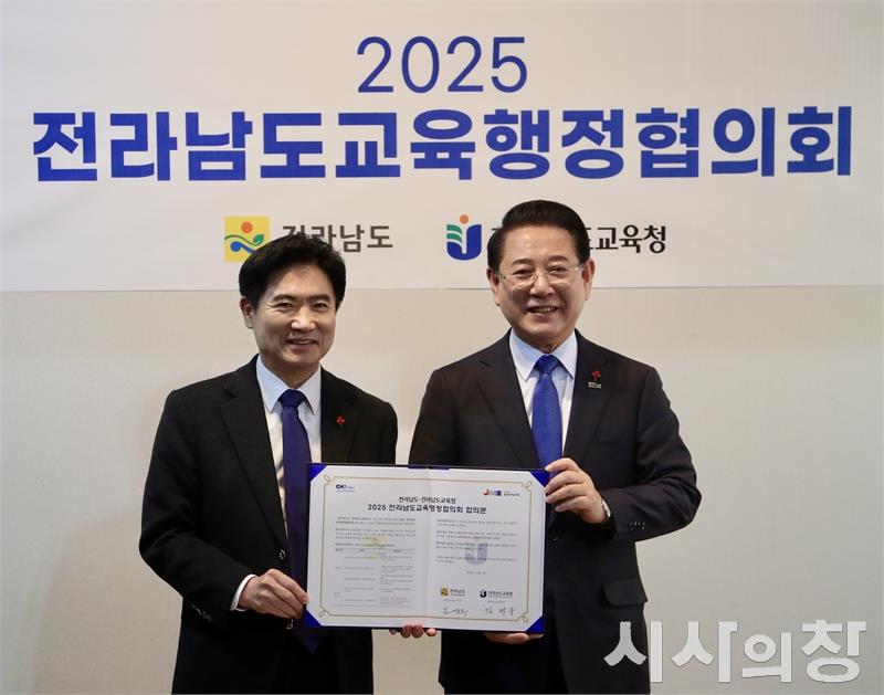 전라남도교육청과 전라남도는 5일 김대중 교육감과 김영록 도지사를 비롯한 주요 간부들이 참석한 가운데 간담회를 갖고 ‘2025 전라남도 교육행정협의회’주요 안건과 지역 교육 협력 과제를 중심으로 심도 있는 논의를 진행했다.사진은 김대중 전라남도교육감(왼쪽)과 김영록 전남도지사가 5일 ‘2025 전라남도교육행정협의회 합의문’을 들고 기념사진 촬영하고 있다.[시사의창=송상교기자]