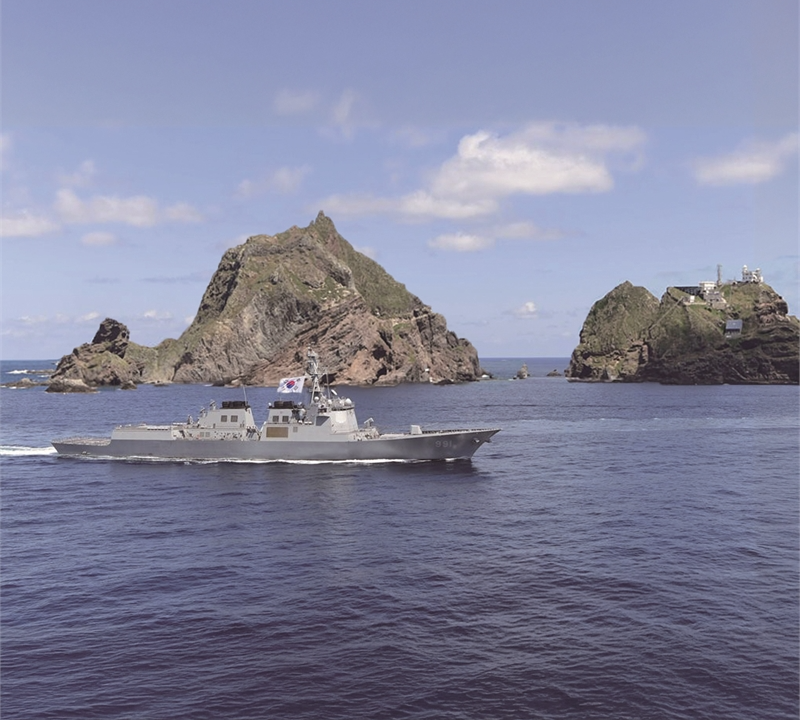 2020년 8월 진행된 동해 영토수호훈련에서 훈련에 참가한 세종대왕함(7,600t급)이 독도 주변을 항해하고 있는 모습. [해군 제공]