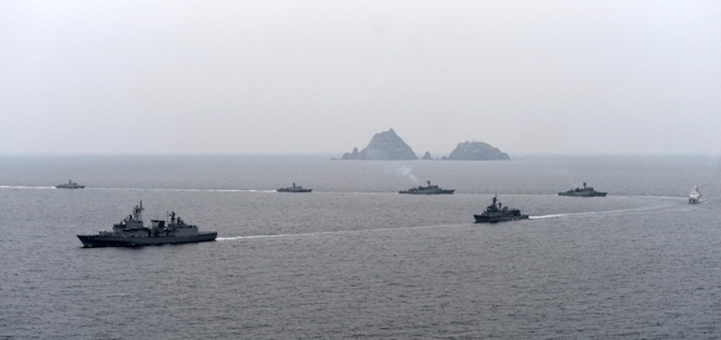2014년 11월 24일 함정과 경비함정의 독도 해상에서 독도방어훈련 모습. [해군 제공)