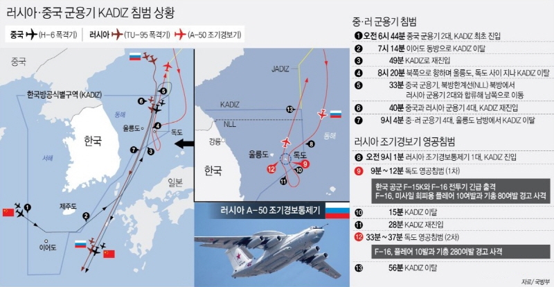 2019년 7월 23일 오전에 중국과 러시아 군용기 5대가 한국방공식별구역으로 진입하였고 한국 공군이 강력 대응 조치를 하였다. 중국 H-6 폭격기 2대와 러시아 Tu-95 폭격기 2대 및 A-50 조기경보 통제기 1대 등 5대가 KADIZ에 진입하였고 러시아 A-50은 독도 인근 영공을 두 차례에 걸쳐 7분간이나 침범하였다.