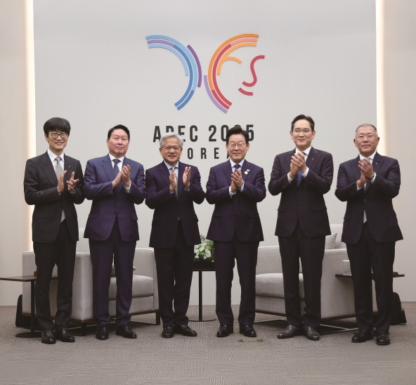 지난 10월 31일 APEC 정상회의장인 경주화백컨벤션센터에서 이재명 대통령이 젠슨 황 엔비디아 최고경영자 접견에 앞서 국내 기업 대표들과 함께 기념촬영을 하고 있다. ©연합뉴스