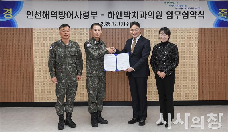 인천해역방어사령부(사령관 준장 정영순)는 "12월 10일 부대 내 회의실에서 인천 미추홀구에 위치한 하앤박치과의원과 업무협약을 체결하며 장병 건강증진을 위한 상호 협력체계를 구축했다"고 밝혔다.