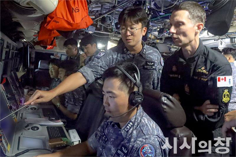 해군은 한미 연합대잠전 훈련인 ‘2025 사일런트 샤크 훈련’에 참가 중인 안무함에 캐나다 잠수함승조원을 편승시켜 12월 5일부터 10일까지 해상훈련을 진행했다.사진은 12월 5일부터 10일까지 진행된 '2025 사일런트 샤크' 해상훈련에서 에티엔 랑글루아캐나다 잠수함사령부 주임원사가 안무함에 편승해 한국 잠수함의 우수한 성능을 직접 체험하고 있다.[시사의창=송상교기자]