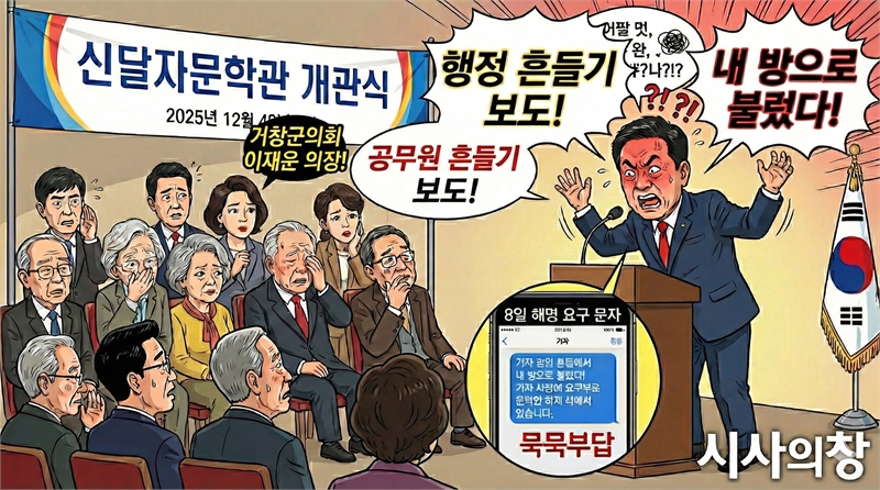 [시사의창=이태헌 기자] 경남 거창군의회 이재운 의장이 전국적인 문학계 인사들이 대거 참석한 ‘신달자문학관 개관식’에서 수준 이하의 축사와 부적절한 언행으로 빈축을 사며 ‘의장 자질론’에 휩싸였다. 여기에 해당 논란에 대한 본지의 해명 요구에도 6일째 묵묵부답으로 일관해 비판을 자초하고 있다.