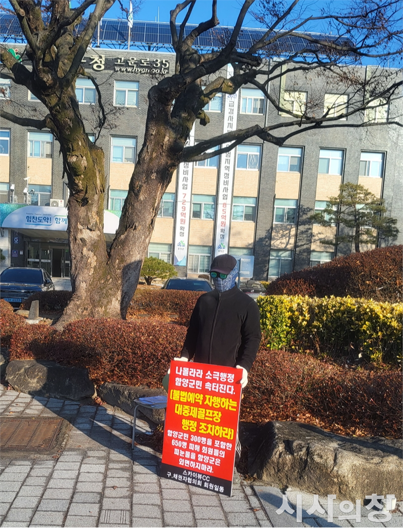 스카이뷰CC 구 회원이 15일 함양군청앞에서 1인 시위를 벌이고 있다.
