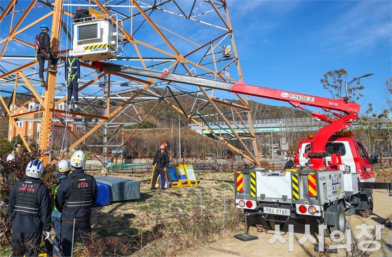 훈련은 철탑 전선 이설 작업 중 상부 작업자의 부주의로 공구가 낙하해 하부 작업자가 이를 맞고 추락, 중상을 입은 뒤 병원으로 이송됐으나 사망에 이르는 가상의 중대재해 상황을 설정해 실전과 같은 긴장감을 조성했다.