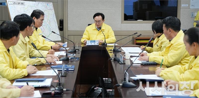 나주시는 가금농장 출하 전 정기검사 과정에서 AI 항원이 검출됨에 따라 농림축산검역본부와 함께 긴급 상황회의를 개최하고 방역 대응 상황을 점검했다고 21일 밝혔다. 사진은 윤병태 시장이 지난 20일 긴급 상황회의를 개최하고 방역 대응 상황을 점검했다.[시사의창=송상교기자]