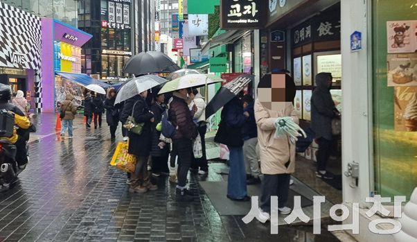 23일, 추운 날씨에 겨울비까지 내리는 명동에는 궂은 날씨에도 불구하고 외국인관광객들로 북적북적한 모습이었다. 사진은 어느 한 유명 식당 앞에 우산을 쓴 채 입장을 기다리는 대기줄이 길게 이어진 모습.