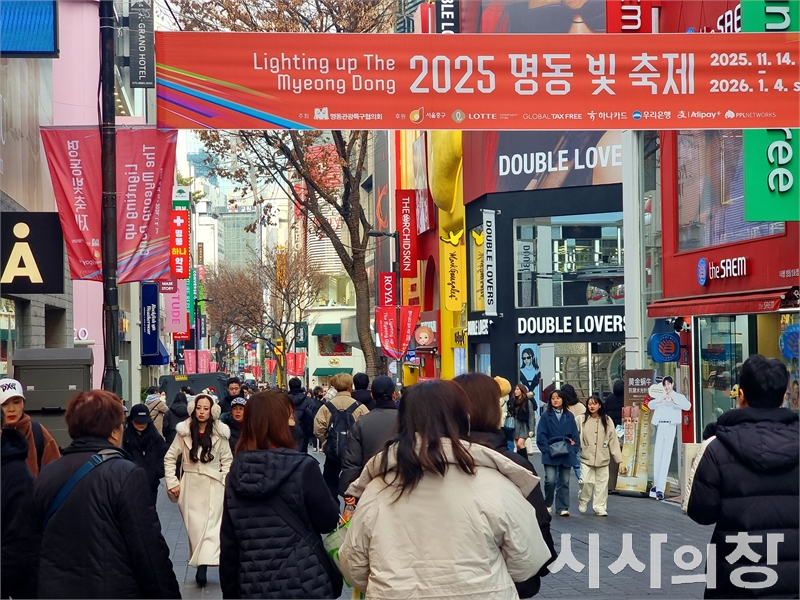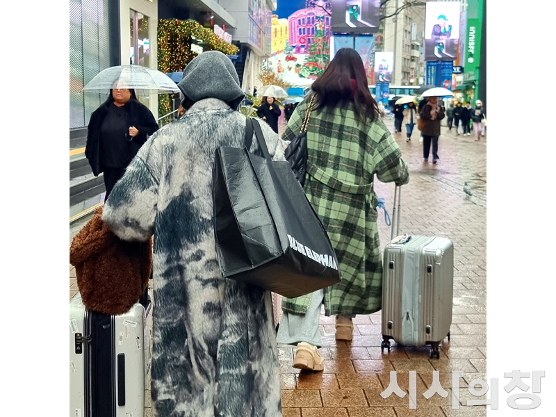 23일 오후, 추운 날씨에 비까지 내리는 궃은 날씨가 무색할만큼 명동 일대는 외국인 관광객들로 붐볐다. 곳곳에서 3~4명씩 무리를 지어 여행용 캐리어를 끌고 다니는 여행객들의 모습이 눈에 띄었다. 우산을 쓴 인파 사이로 각국의 언어가 뒤섞여 흘러나왔고, 화장품 매장과 환전소 앞에는 줄이 길게 늘어섰다. 비에 젖은 네온사인이 아스팔트 위로 번지듯 비치고, 그 아래서 외국인 관광객들은 발걸음을 재촉하거나 잠시 멈춰 서서 쇼윈도를 들여다봤다. 비가 오는 평일 오후라는 사실이 믿기지 않을 만큼 명동은 다시 ‘관광의 중심’으로 돌아온 모습이었다.
