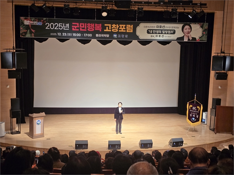 [시사의창=최진수기자] 전북특별자치도 고창군이 연말 군민 마음 돌봄에 방점을 찍었다. 고창군은 지난 12월 23일 오후, 동리국악당에서 TV 프로그램 ‘이혼숙려캠프’ 컨설팅 위원으로 알려진 이호선 교수를 초청해 ‘군민 행복 고창포럼’을 열고, ‘내 인생의 힐링캠프’를 주제로 군민들과 공감의 시간을 가졌다. 한 해의 피로와 긴장을 내려놓고 스스로를 돌아보게 하는 메시지가 현장을 채웠다.