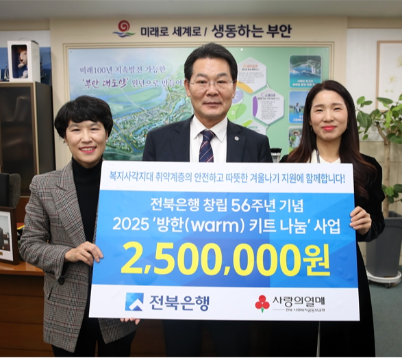 전북은행 부안지점(지점장 신정화)은 이날 전북은행의 겨울철 대비 사회공헌 프로그램인 ‘방한(warm)키트 나눔’ 사업을 통해 방한키트 60세트를 부안군에 전달했다. 이번 키트는 담요, 귀마개, 온열방석, 장갑, 핫팩, 수면양말 등 6종으로 구성돼 있다. 추운 겨울을 보다 따뜻하고 안전하게 보낼 수 있도록 관내 취약계층에게 전달될 예정이다.