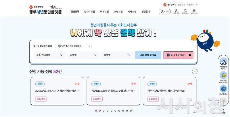 [시사의창=송상교기자] 광주광역시(시장 강기정)가 원스톱 서비스로 개편해 지난 4월 정식 개통한 ‘광주청년통합플랫폼’이 개통 9개월 만에 누적 방문자 수 132만 명을 돌파하며 청년정책 전달의 핵심 창구로 자리매김하고 있다.