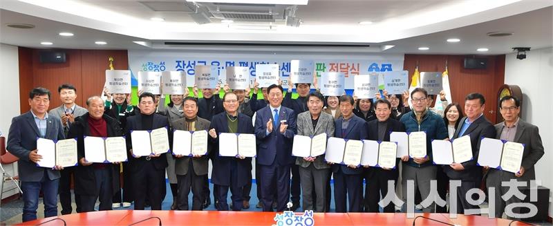 장성군이 지난 24일 군청 상황실에서 11개 읍면 주민자치위원장과 읍면장이 참석한 가운데 ‘읍면 평생학습센터’ 지정서 및 현판 전달식을 가졌다._장성군이 지난 24일 상황실에서 ‘읍면 평생학습센터’ 지정서 및 현판 전달식을 가졌다. [시사의창=송상교기자]