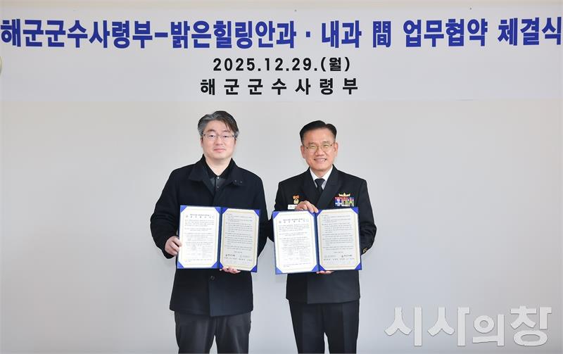 해군군수사령부(사령관 소장 안상민)는 "29일 진해 공관에서 밝은힐링안과·내과의원과 업무협약을 체결하고, 장병과 가족을 아우르는 실질적인 의료복지 확대에 나섰다"고 밝혔다.