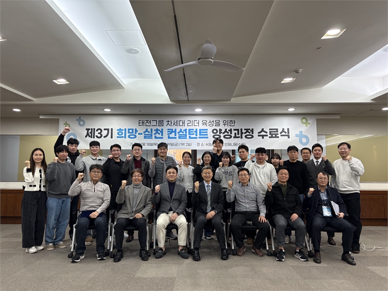 [시사의창=김성민 기자] 태전그룹(태전약품·티제이팜·서울태전·광주태전·티제이에이치씨)이 약 7개월간 진행한 ‘제3기 희망-실천 컨설턴트 양성과정’을 마무리하고, 지난 19일 수료식을 열었다. 행사는 KB손해보험 연수원 ‘인재니움’에서 1박 2일 일정으로 진행됐고, 수료생 18명과 러닝코치 5명, 일부 임원이 참여해 과제 발표와 성과 공유로 대미를 장식했다.