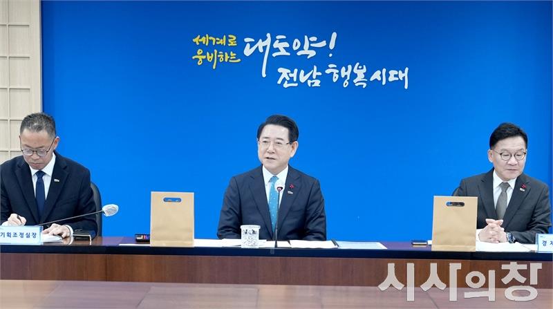 김영록 전라남도지사는 30일 “중앙부처 업무보고를 잘 분석해 많은 사업을 가져오도록 하고 2026년 새로운 도 자체사업도 발굴하면서 특히 AI·에너지시대 광주·전남이 대부흥하는 새해를 준비하자”고 강조했다._김영록 전라남도지사가 30일 도청 서재필실에서 실국장 정책회의를 주재하고 도정 현안에 대해 논의하고 있다.[시사의창=송상교기자]