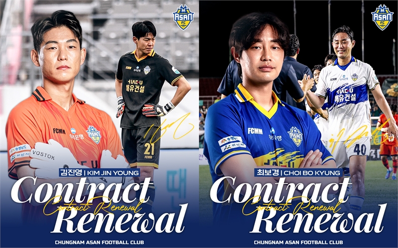 [시사의창=김성민 기자] 충남아산FC가 베테랑 골키퍼 김진영과 베테랑 수비수 최보경을 붙잡았다. 구단은 두 선수와의 재계약으로 2026시즌 수비 조직의 뼈대를 먼저 세우겠다는 구상을 굳혔다.