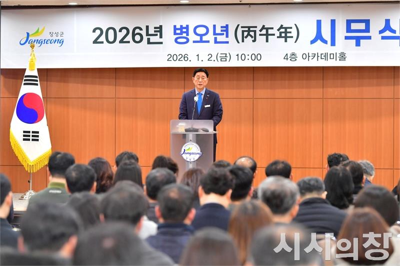 [시사의창=송상교기자] 장성군(군수 김한종)이 2일 오전 군청 아카데미홀에서 시무식을 열고 2026년 군정의 힘찬 출발을 알렸다. 이날 행사에는 김한종 군수를 비롯해 부서장과 공무원 등 500여 명이 참석했다.