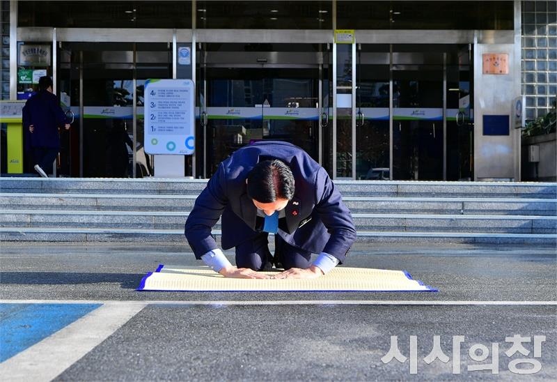 장성군이 2일 오전 군청 아카데미홀에서 시무식을 갖고, 한 해 업무의 시작을 알렸다. 사진은김한종 군수가 2일 군청 앞에서 군민을 향해 큰절을 올리고 있다. [시사의창=송상교기자]