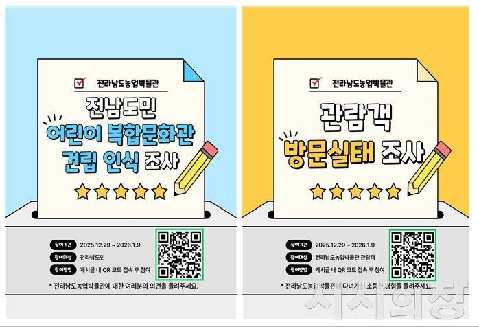 [시사의창=송상교기자] 전라남도농업박물관(관장 김옥경)이 관람객 이용 실태를 파악하고 어린이 복합문화관 건립에 대한 도민 인식을 수렴하기 위해 9일까지 두 가지 설문조사를 실시한다.