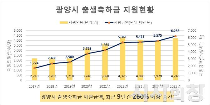 광양시는 최근 9년간 출생축하금 지원 규모를 꾸준히 확대해 왔다. 2017년 17억2,400만 원에서 2025년 62억3,500만 원으로 예산이 약 260% 이상 증가했으며, 출생아 수 감소 속에서도 출생가정을 중·장기적으로 뒷받침하겠다는 정책 의지를 유지해 왔다.