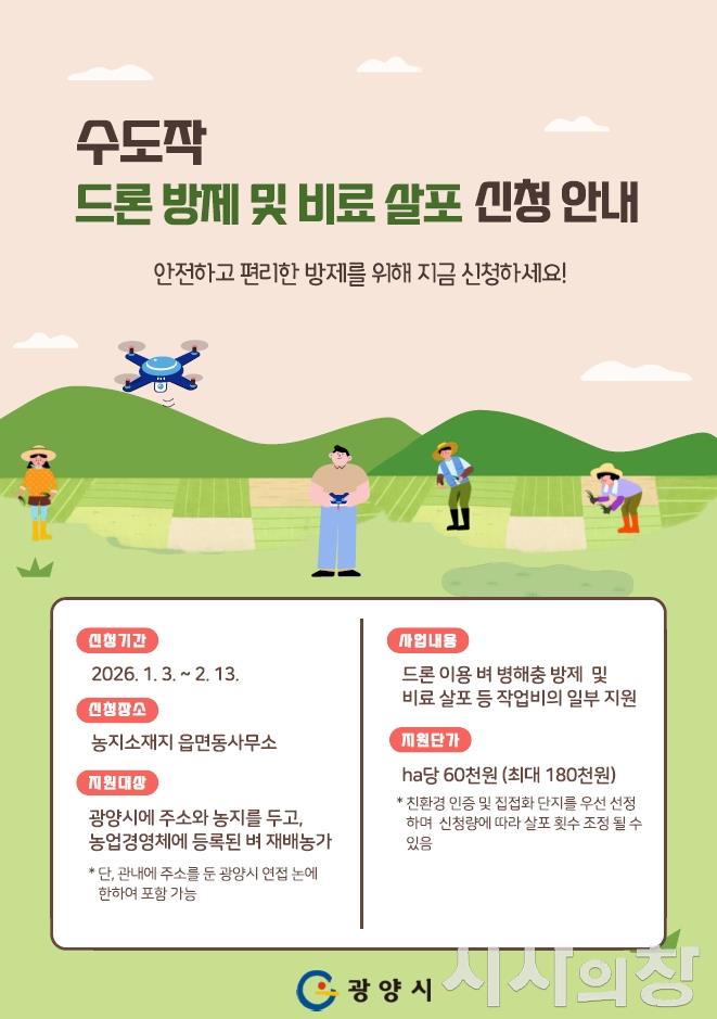 광양시가 벼 재배 농가의 노동력 부담을 줄이고 생산비를 절감하기 위해 2026년도 ‘수도작 드론 방제 및 비료 살포 지원사업’을 시행한다고 밝혔다.시는 총 1,166ha를 대상으로 사업비 1억 600만 원을 투입하여 1~2월 중 신청을 받은 후, 병해충이 집중 발생하는 7~9월에 드론 방제를 추진할 계획이다.지원단가는 ha당 6만 원 이내다.[시사의창=송상교기자]