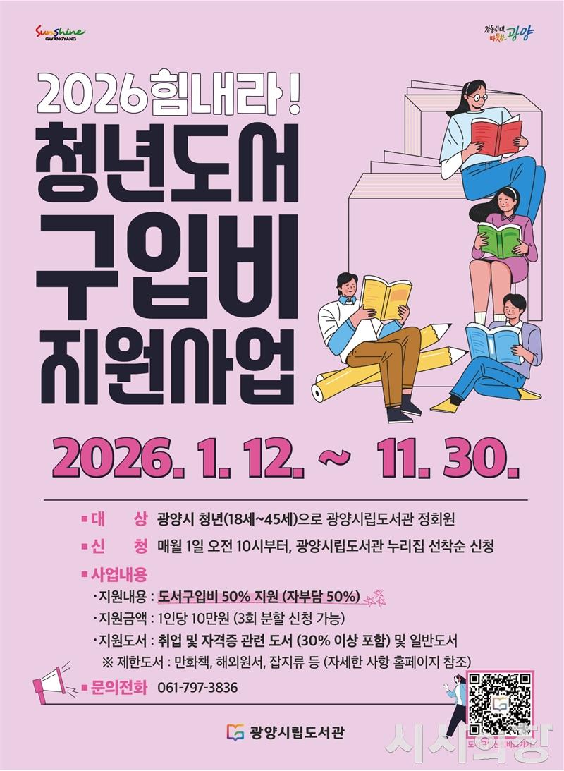 광양시립도서관이 청년들의 취업 및 진로 준비 과정에서 발생하는 경제적 부담을 줄이기 위해 1월 12일부터 ‘힘내라! 청년 도서 구입비 지원’ 사업을 시행한다. 본 사업은 취업․진로 준비 장기화로 어려움을 겪는 청년들을 지원하기 위해 2019년부터 추진해 온 사업으로, 2025년에는 총 2,108명이 참여해 9,708권의 도서를 지원했다.[시사의창=송상교기자]