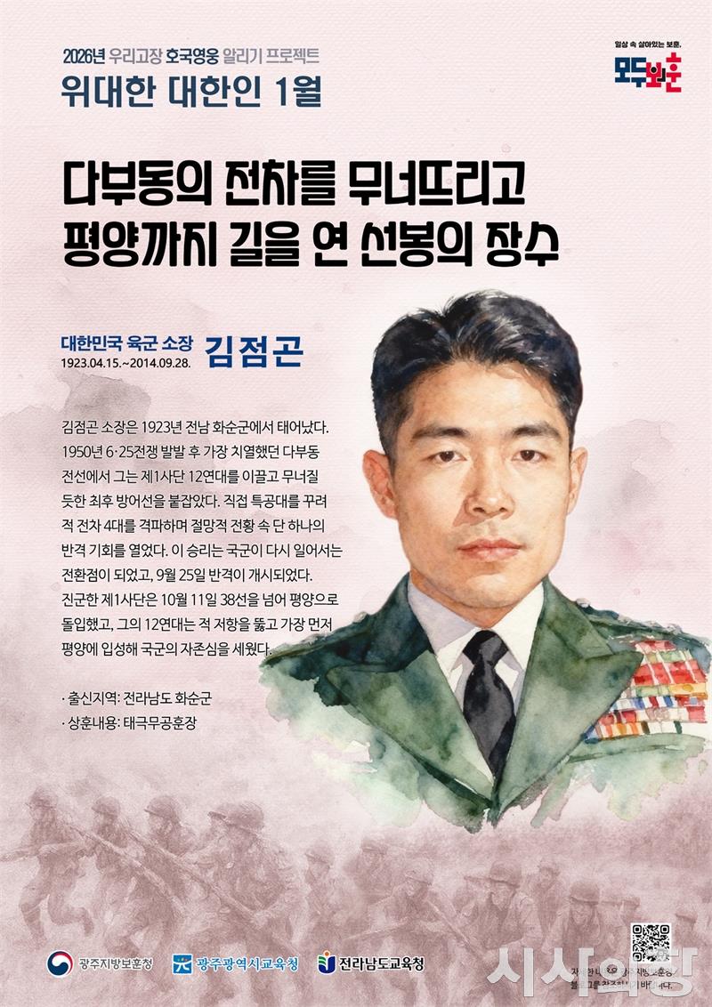 [시사의창=송상교기자] 광주지방보훈청(청장 직무대리 김종일)은 "2026년 1월 ‘우리고장 위대한 대한인’으로 김점곤 육군 소장을 선정했다"고 5일 밝혔다.