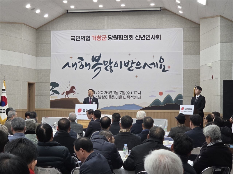 국민의힘 거창군 당원협의회는 7일 거창군 남상면 어울림마을 다목적센터에서 신년인사회를 개최했다. 이날 행사에는 신성범 국회의원을 비롯해 구인모 거창군수, 박주언·김일수 도의원, 이재운 거창군의회 의장과 신중양 부의장, 군의원(김향란·최준규·이홍희·표주숙·신재화·박수자·김혜숙) 전원, 주요 당직자 및 책임당원 등 250여 명이 참석해 성황을 이뤘다.