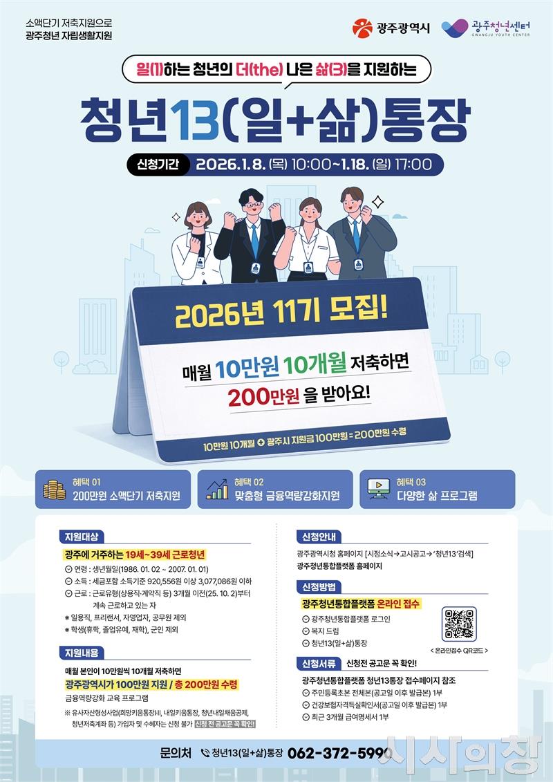 [시사의창=송상교기자] 광주광역시(시장 강기정)가 일하는 청년들의 자산 형성과 금융 역량 강화를 위해 ‘청년13(일+삶)통장’ 제11기 참여자를 모집한다. 이번 모집은 8일부터 18일까지 진행되며, 총 620명의 근로청년을 선발할 예정이다.