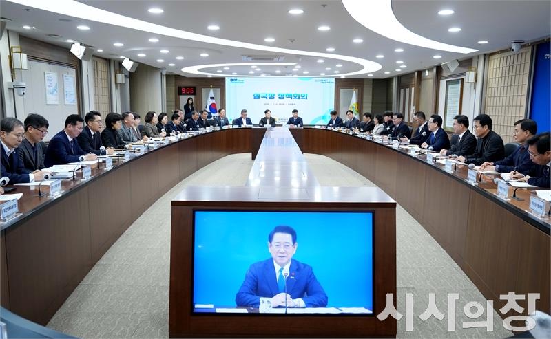 전라남도 김영록 도지사는 7일 조직의 청렴도 개선·정착, ‘가짜 일’을 없애 일 하면서도 즐거운 직장문화 만들기, 광주·전남이 균형발전 기조 속 새롭게 대부흥 기반을 이룰 행정통합의 신속 추진을 새해 역점 업무로 제시했다._김영록 전라남도지사가 7일 도청 서재필실에서 실국장 정책회의를 주재하고 도정 현안을 논의하고 있다.[시사의창=송상교기자]